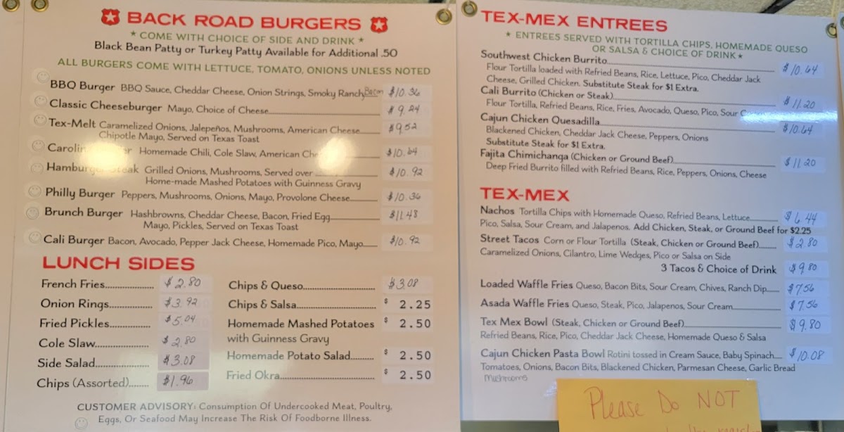 The friendly and knowledgeable staff enhance the atmosphere, making you feel right at home. Guests appreciate the fair prices and the cheerful vibe, amplified by upbeat music and cozy picnic seating. Whether for breakfast, lunch, or dinner, Tex-Mex Back Road Grill is a cherished gem where excellent food meets even better company.